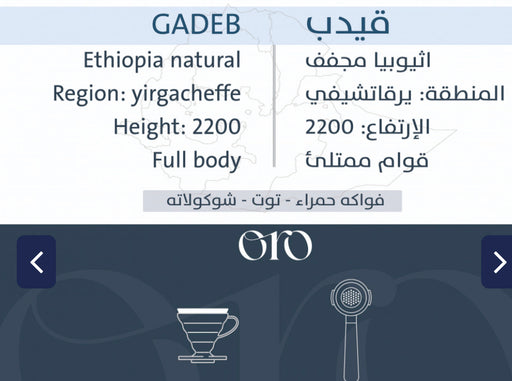 تفاصيل المنتج: الوزن: 250g المنطقة: قيدب – إثيوبيا الارتفاع: 2050 م المعالجة: مجففة (Natural) الإيحاءات: شمام، فانيلا، توت , كراميل الاستخدام: يناسب الفلتر والإسبريسو