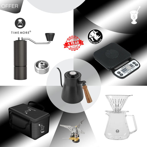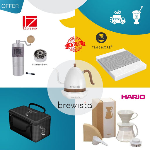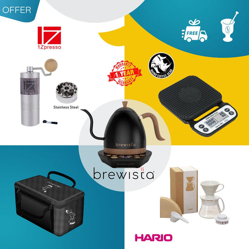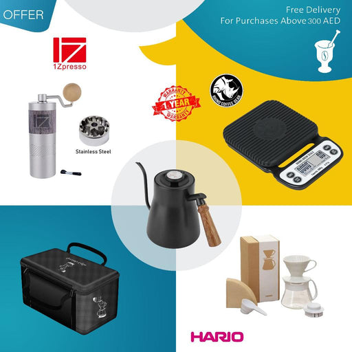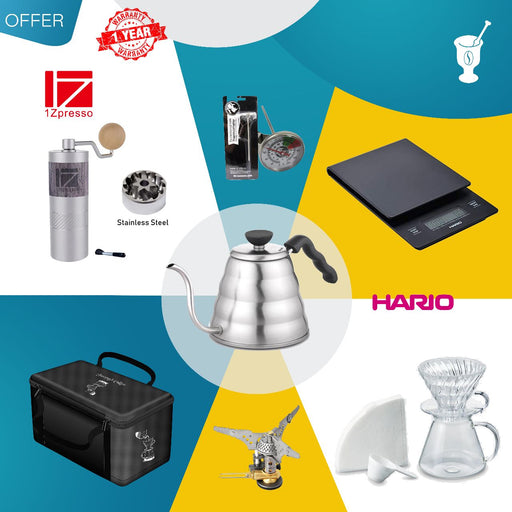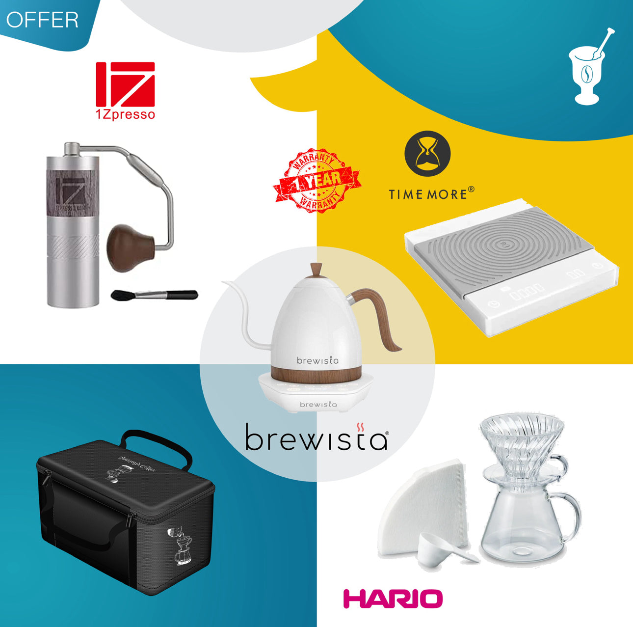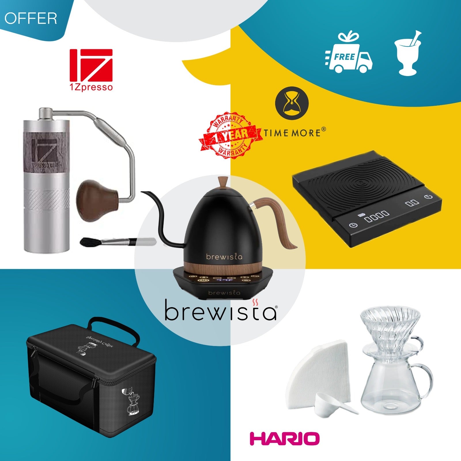 set of V60 tools include: -Hario V60 02 Dripper - Hario V60 02 Service 600 ml - Hario 40 Filter Papers - Hario Measuring Spoon - 1zpresso Q2 grinder 38mm burr - Brewista electric smart kettle white new version -Timemore New version White Mirror Basic Plus (Non-Smart Version) -Flexible Coffee bag Large عدة هاريو v60